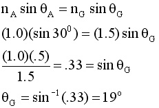 . A ray of light is incident at 30 degrees in air on an air-glass boundary. What angle does the ray make with the normal in glass?