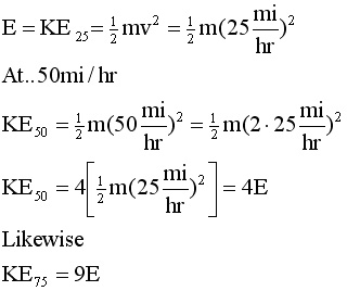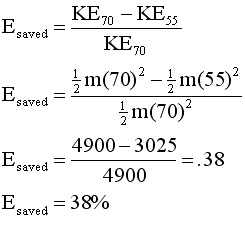 7. Assume that it takes a certain amount of energy, E, to cause a car to move at 25 miles/hour. a) In terms of E, how much energy will it take to make the car move at 50 mi/hr? 75 mi/hr? b) In 1978, the maximum speed allowed on the Maine Turnpike was reduced from 70 to 55 mi/hr as an energy conservation measure. What fraction of the energy used as 70 mi/hr was saved by this maneuver?