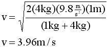 With more than one object moving, the law of conservation of energy takes a different form. Where does the energy come from? = where did it go? See line 3. The blocks have the same speed because they are tied together. The third bar in the equal sign means "equal by definition". |