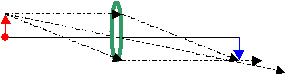 A convex lens (green) has a focal length of +20 cm. An object (in red) is placed 50 cm to the left of the lens. Determine the nature (real or virtual), position (how far from the lens) and magnification of the image (in blue). |