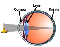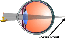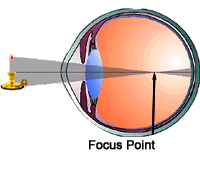 While it will always be a marvelous construction, the eye from time to time does malfunction. The most common eye disorder is nearsightedness,more commonly known as myopia . There are two schools of thought on the cause of myopia. Some suggest that it is hereditary and exists because the eyeball slightly longer than it should be. In the other theory it is held that behavior, specifically great amounts of close work, weaken the ciliary muscles so that the eye cannot focus things are far away. In either case, the image comes to a focus in front of the retina . See the diagram above. The condition can be corrected by a diverging lens, most often a meniscus concave (a.k.a. convexo-concave). Such a lens in a spectacle frame is an imposing piece of glass or plastic being much thicker at the edge than at the center. The reader shoiuld note that the glass is this thickness mostly for its own safety--well beyond being shatter-prone. A soft contact lens is fashioned as meniscus concave and is called hydrophilic,literally "water-loving", because it has 40% water composition. This small wisp of plastic soaked in saline does all of the additional refraction necessary to put a sharp image on the retina.