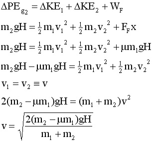 If friction enters the pictuure, we treat it as another place for energy to go. Note that in the bottom line, if um1 is greater than m2, the radicand goes negative and the blocks do not move when released. |
